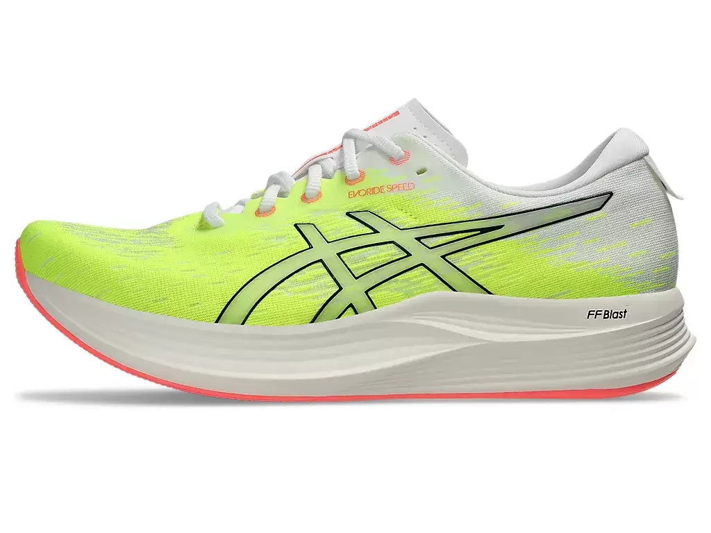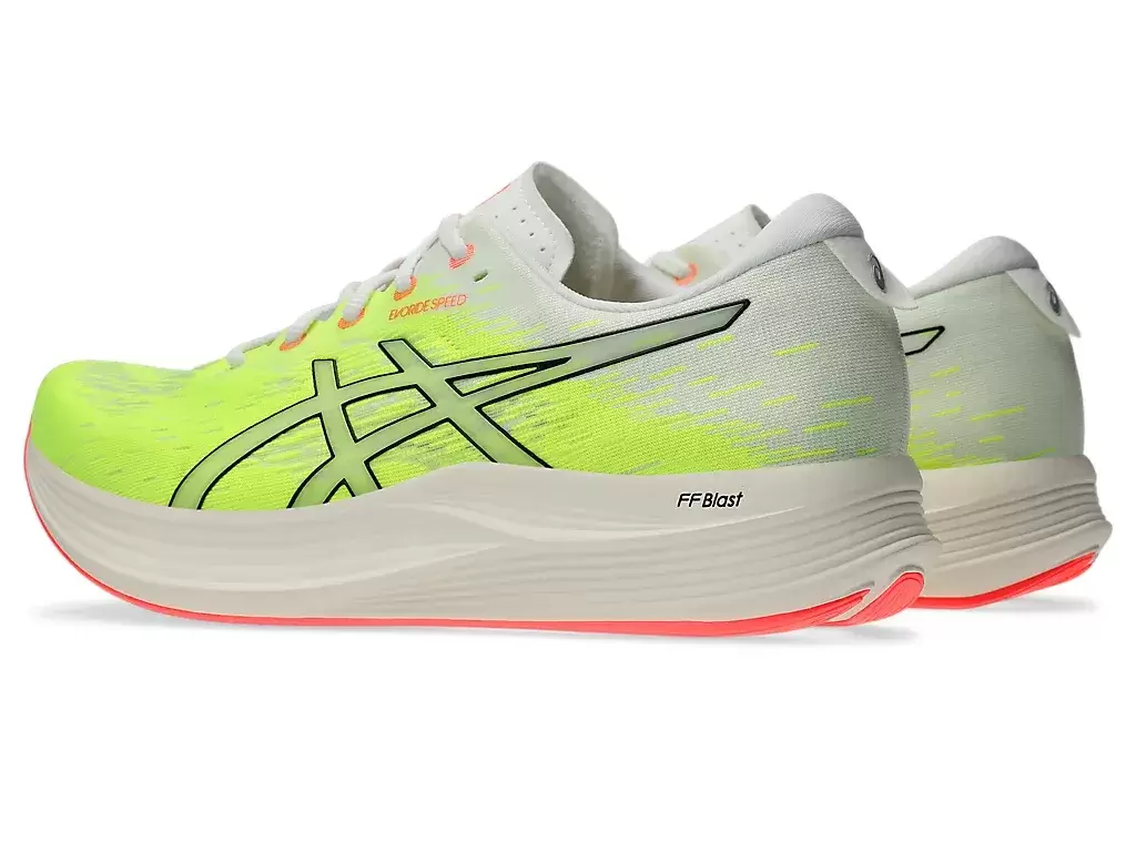 EVORIDE™ SPEED 2 -kenkä on kevyt lenkkari, joka on suunniteltu säästämään energiaa enemmän kuin edellinen versio. Tämän lenkkarin päivitykset keskittyvät nopeuteen, mukavuuteen ja istuvuuteen. FF BLAST™ -pehmuste edistää pehmeämpiä laskeutumisia ja reagoivaa palautumista. Samaan aikaan 3D SPACE CONSTRUCTION™ -ominaisuus auttaa vähentämään painoa ja parantamaan muodonmuutosta. Lopuksi, AHAR™-kumipohjamateriaali tarjoaa paranneltua kestävyyttä erilaisilla pinnoilla.