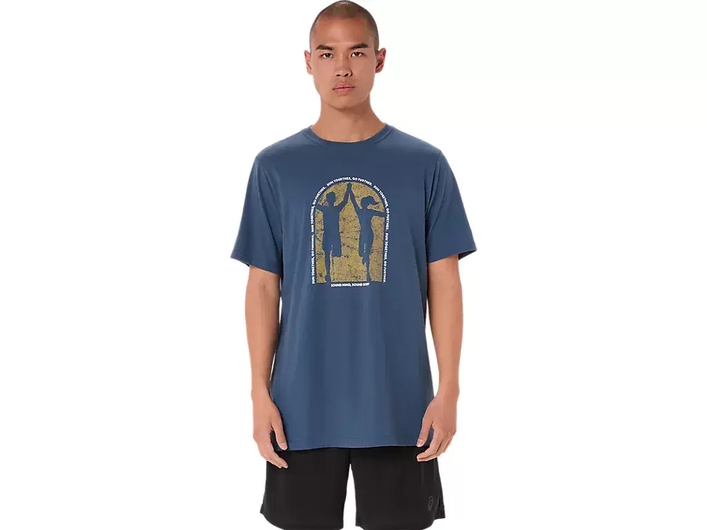 Tämä mukava neulottu lyhythihainen t-paita tunnustaa maailman mielenterveyden tärkeyden. Etupuolella on kaksi juoksijaa kädestä pitäen ja keskellä kiertää lause ”RUN TOGETHER, GO FURTHER”.