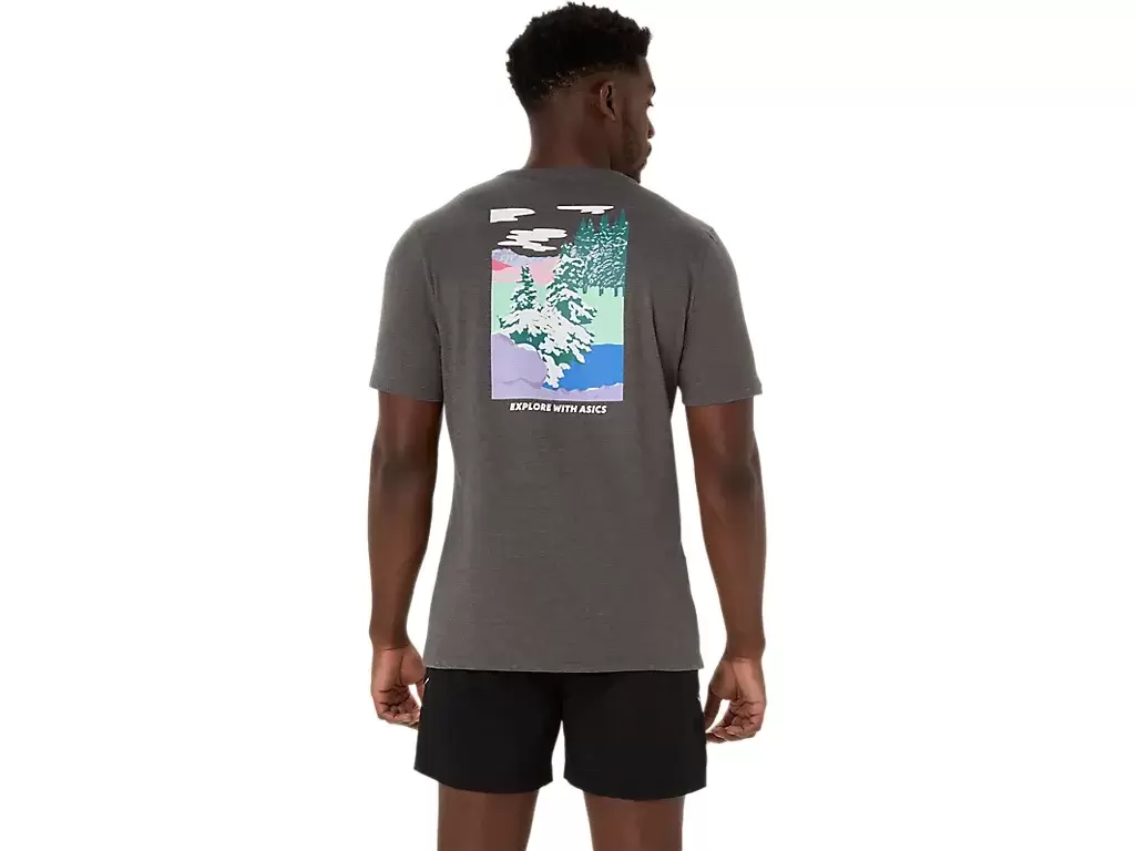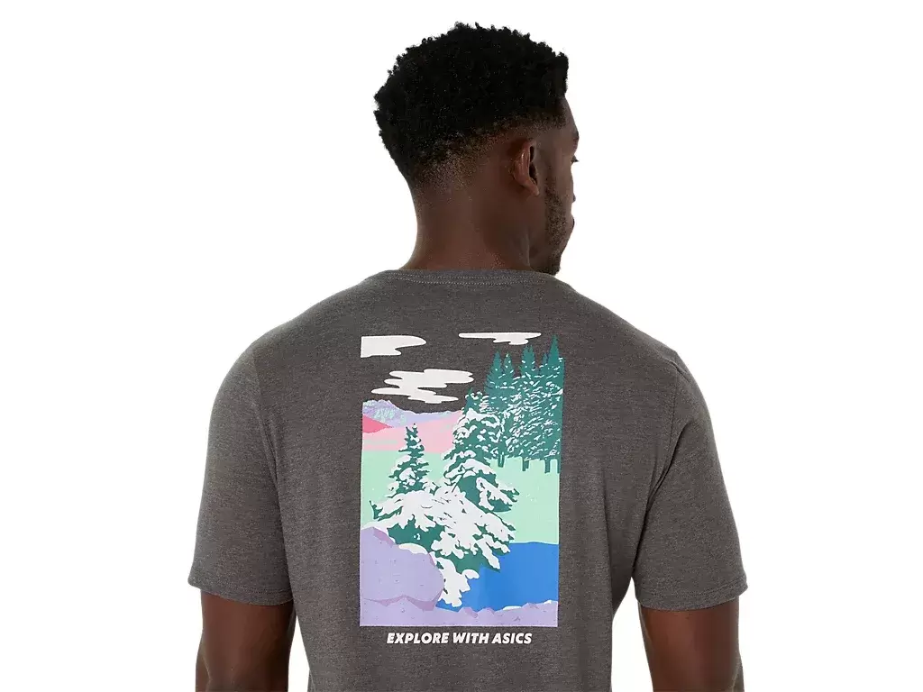 Tämä mukava neulottu lyhythihainen t-paita on saanut inspiraationsa luontokuvista. Siinä on seesteinen metsäkuvio, jonka rinnassa on teksti ””EXPLORE WITH ASICS””.