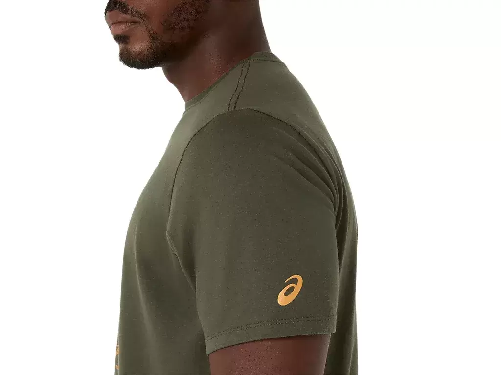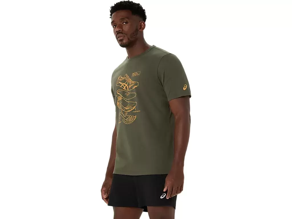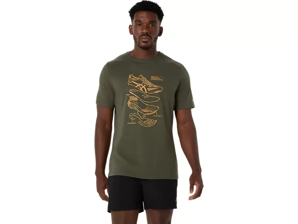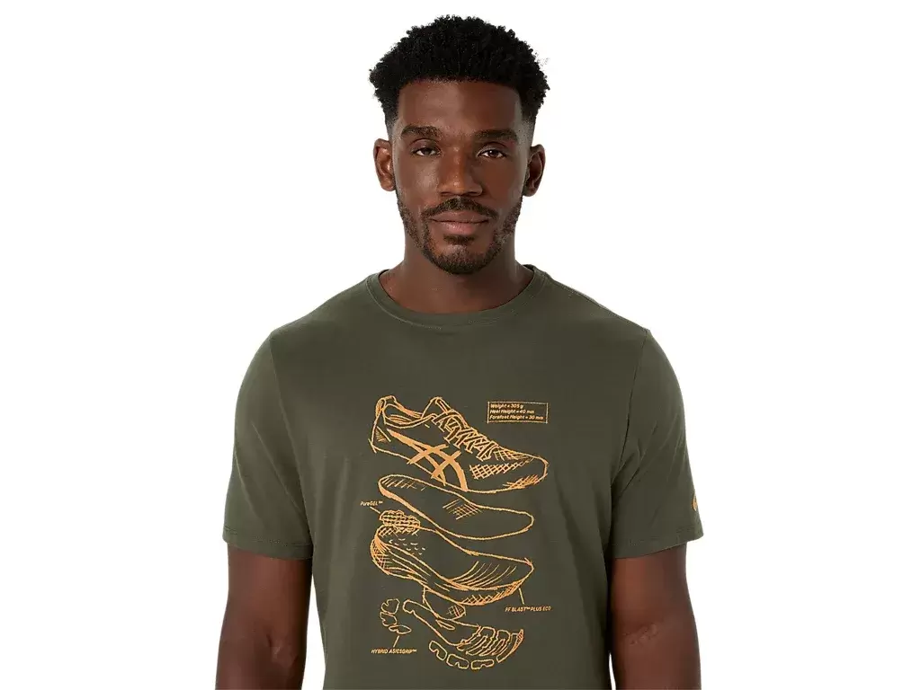 Tämä mukava neulottu lyhythihainen t-paita on saanut inspiraationsa ASICSin suorituskykyisten juoksukenkien luonnoksista. Paidan etupuolella on grafiikka, joka esittelee juoksukenkiemme valmistuksessa käytettyjä eri komponentteja.