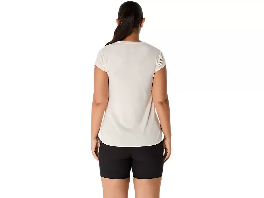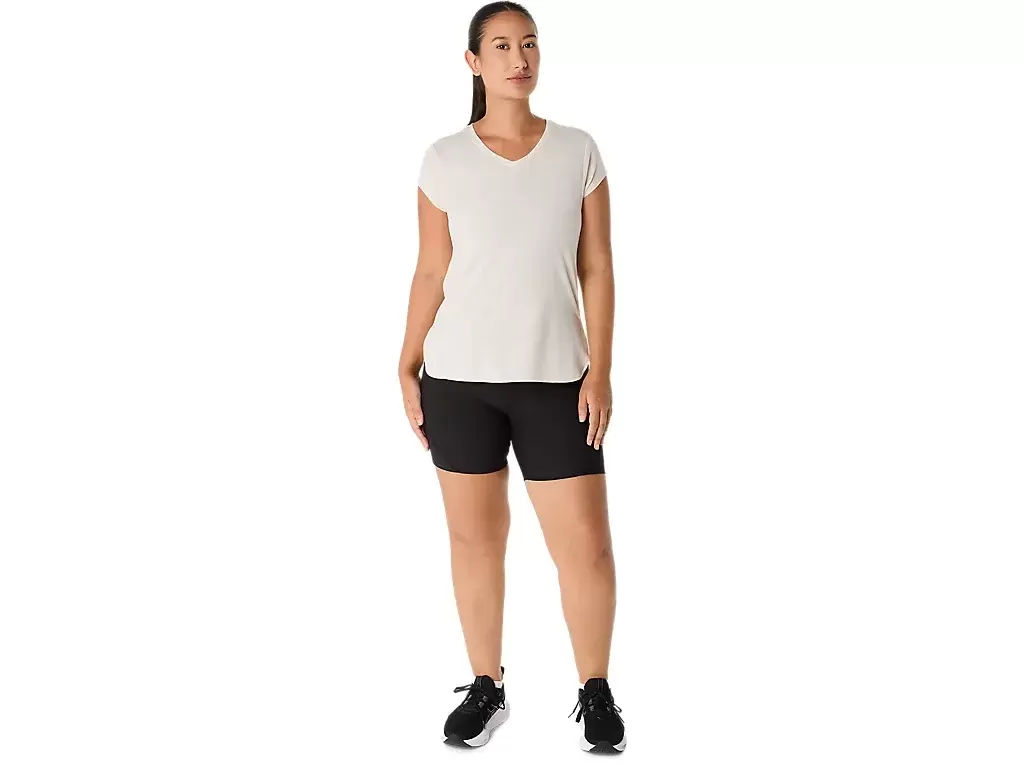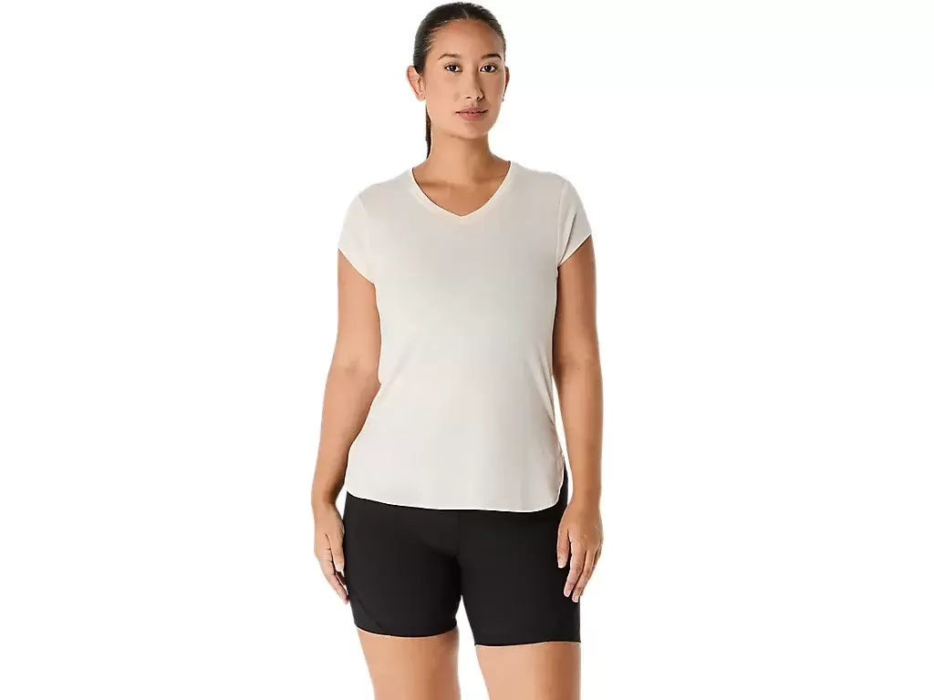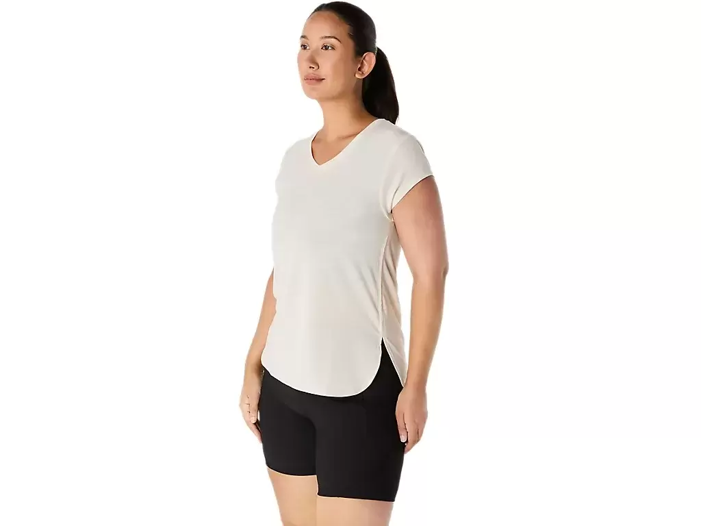Tämä lyhythihainen V-aukkoinen paita on suunniteltu tarjoamaan tyylikkään tuntuman ihoa vasten. Siinä on mukava neulos, joka on yhdistetty eteenpäin suuntautuviin sivusaumoihin liikkumisvapauden parantamiseksi.